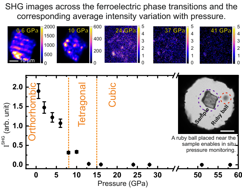 Il permet de combiner, avec une même cellule à enclume diamant, des expériences sur grandes installations synchrotron et des mesures optiques à haute pression en laboratoire, notamment en microscopie optique nonlinéaire. L’intégration d’une mesure in situ de la pression par fluorescence, réalisée directement dans un microscope de génération de seconde harmonique (SHG), garantit un suivi précis et continu des conditions expérimentales. La conception et l’intégration de ce dispositif reposent sur des développements instrumentaux en optique et en mécanique réalisés à l’IPCMS. Il a permis de mettre en évidence des transitions de phase ferroélectriques induites par une pression hydrostatique allant jusqu’à 60 GPa dans KNbO₃, une pérovskite ferroélectrique de référence. Publiés dans Physical Review Letters, ces travaux résultent d’une collaboration entre, l’Université du Luxembourg, l’Institut Néel et les synchrotrons SOLEIL et ESRF, et ouvrent de nouvelles perspectives pour l’étude multimodale des matériaux ferroélectriques sous conditions extrêmes.